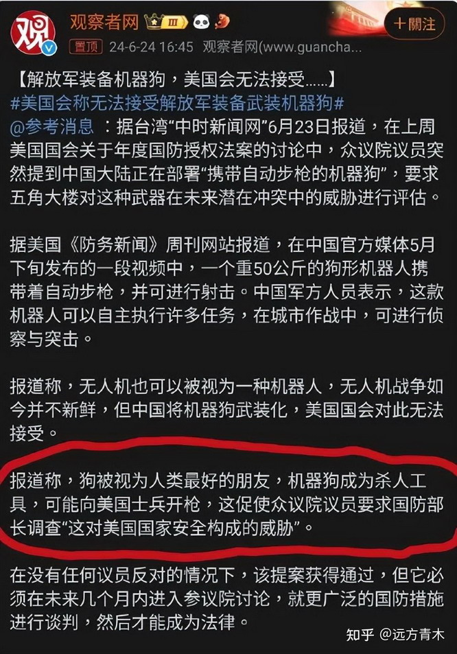 报道称原因为狗是人类最好的朋友,机器狗成为杀人工具,可能向美军士兵开枪,这无法接受,对美国国家安全构成了严重威胁。