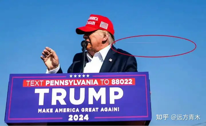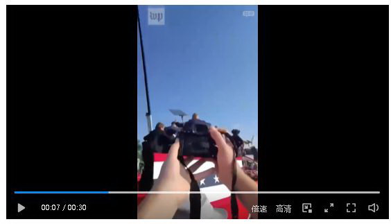 根据现场高清视频,子弹轨迹清晰可见的掠过了特朗普头部附近,离爆头只差一丝。