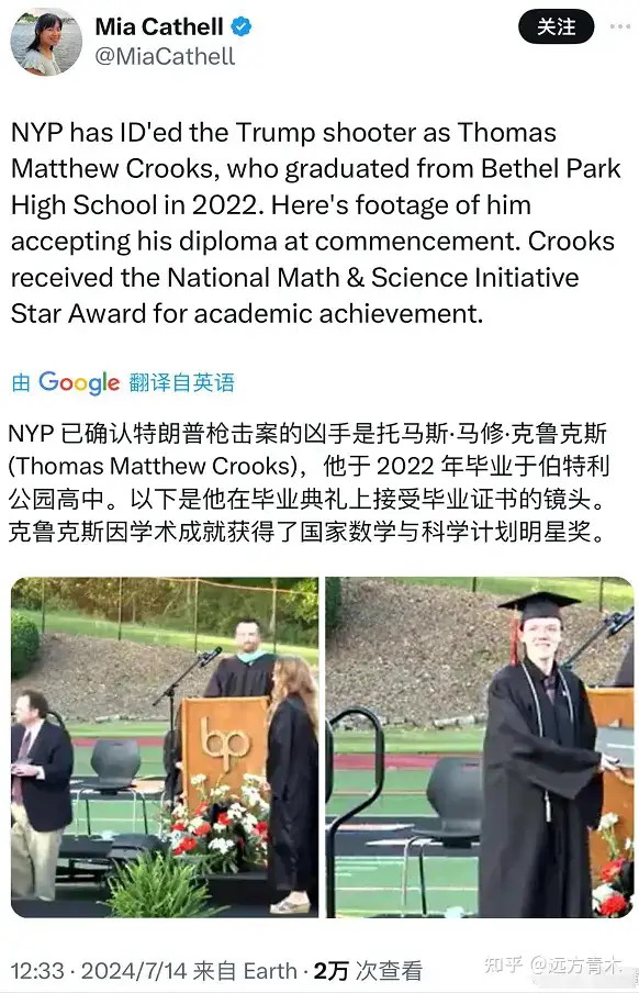 凶手身份为一名宾夕法尼亚州的白人男性,20岁,名为托马斯·马修·克鲁克斯,2022年毕业于伯特利公园高中,曾因学术成就获得了美国国家数学与科学计划明星奖,选择刺杀特朗普的原因还在调查。