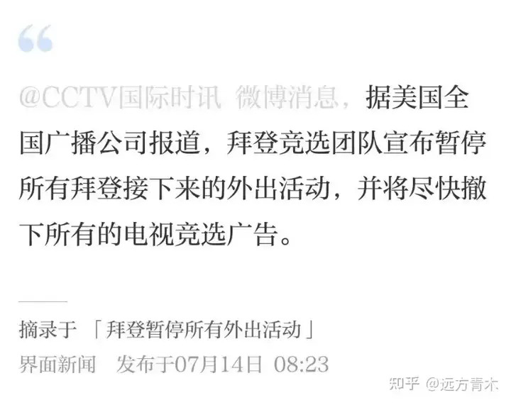 刺杀事件发生14小时之后,拜登选举团队宣布暂停拜登所有的外出活动,同时撤下所有的电视竞选广告,这种行为和认输投降已经没有区别了。