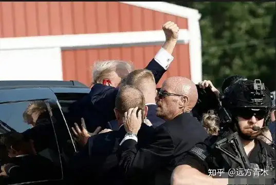 这个高举拳头的形象,特朗普一直保持着,甚至在被护卫特工塞进车里的时候还在高举拳头,而且一直在持续高喊USA的口号,这才给了摄影师拍下经典照片的机会。