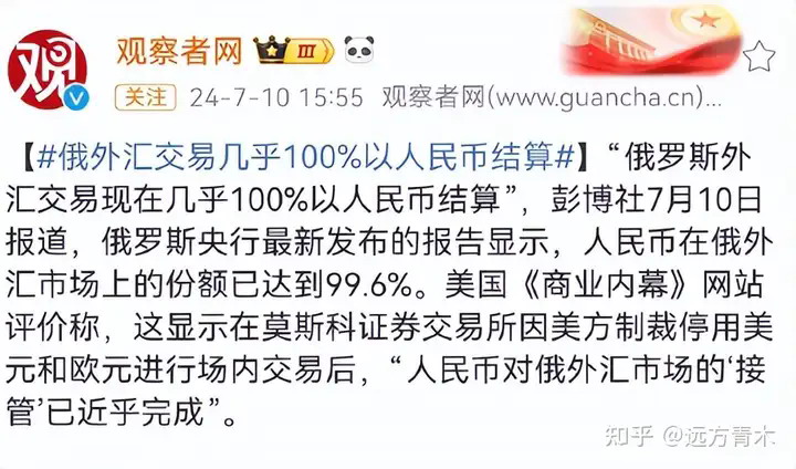 2024年7月,俄罗斯央行宣布人民币在俄外汇市场上的份额已经达到了99.6%,整个俄罗斯几乎完全使用人民币进行结算。