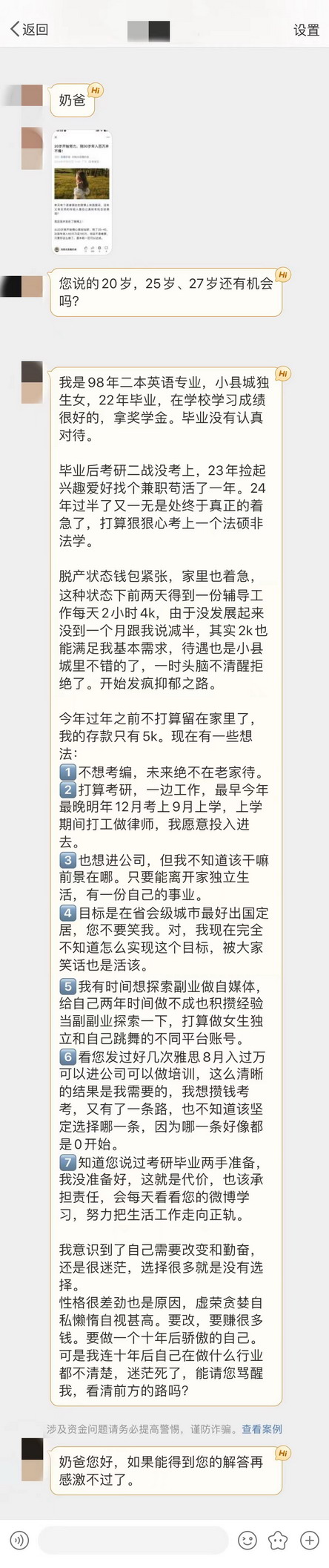 好了,不赞同我说的,要赶紧投身职场,抓住每次微小机会,慢慢提升自己这个观点。