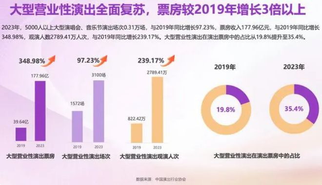 先看一组数据。2023.年,国内大型营业性演出票房收入.177.96.亿元,同比.2019.年增长.348.98%,也就是三倍有余。