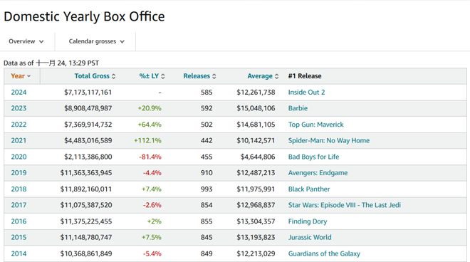 外国票房也一样在走下坡路啊!