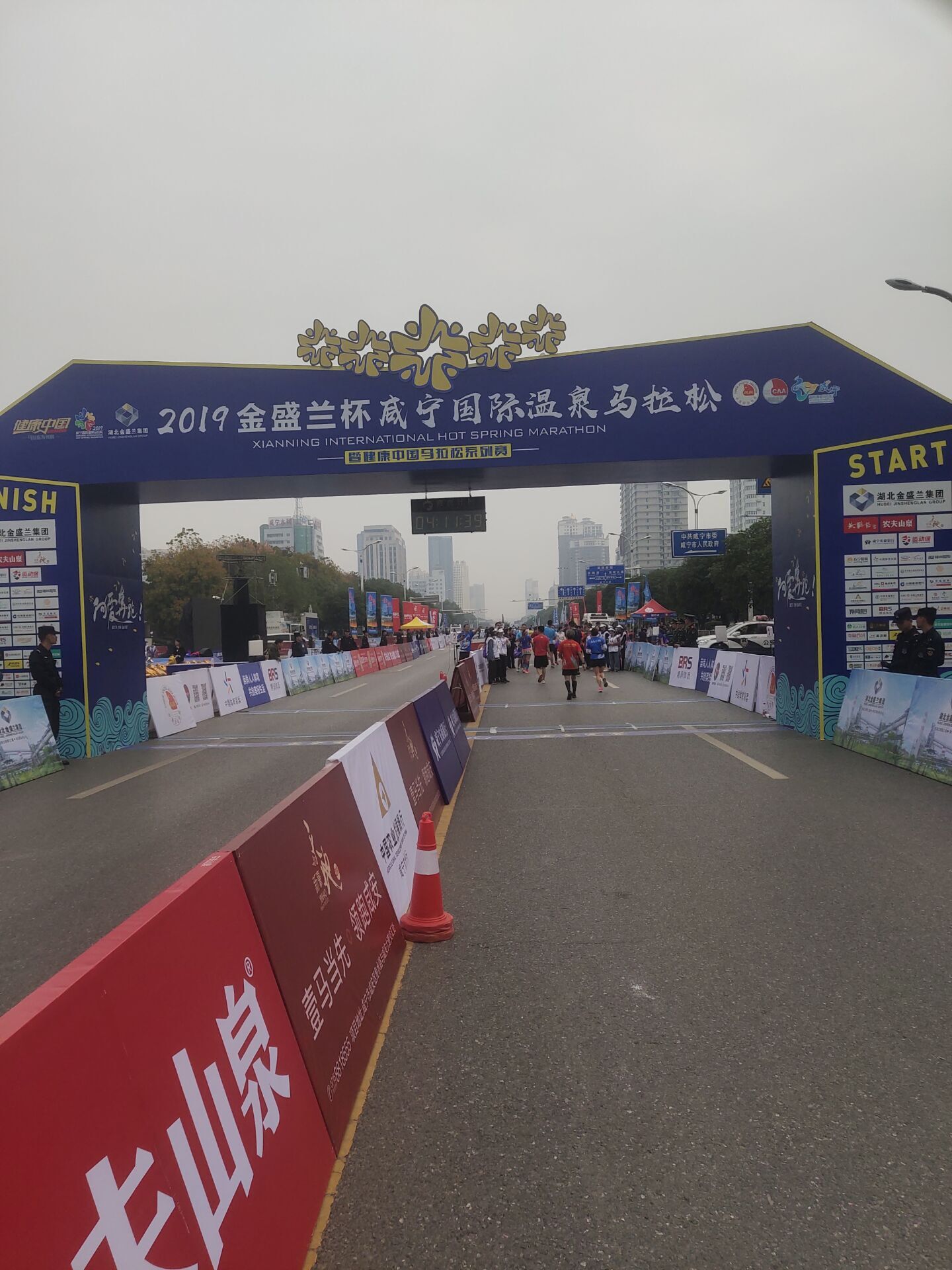 41公里,到了最后的直线了,已经可以远远看到终点了,甚至可以看到边缘区域的志愿者们已经在收拾东西了,也是啊,毕竟冠军应该一个半多小时前就产生了,半马人员也基本跑完了,全马跑得慢没人权啊。