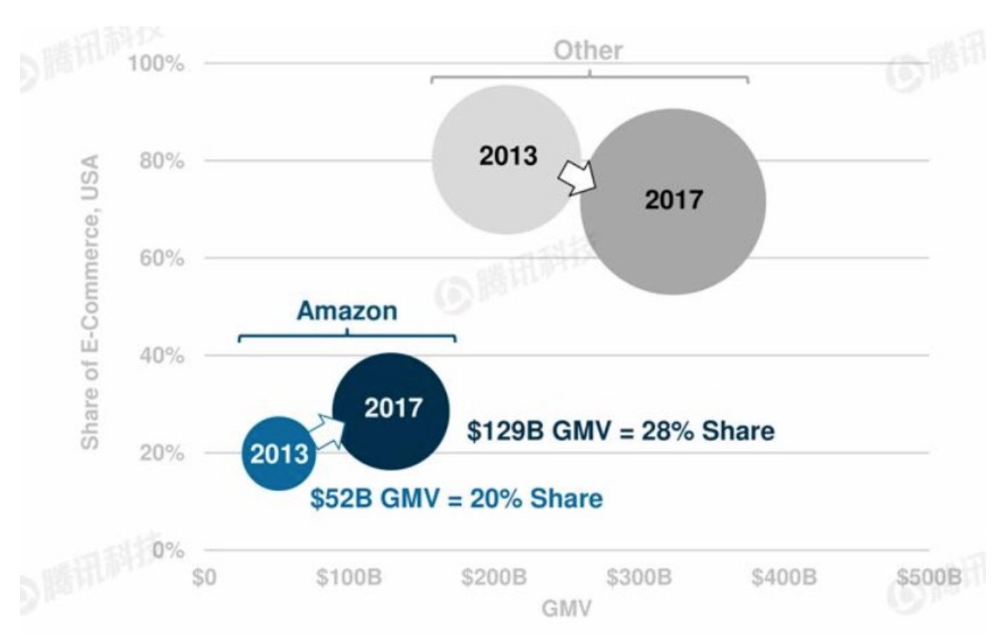 图2,从2013年到2017年美国电子商务公司的市场份额变化。亚马逊的份额从20%提升到28%,其他所有公司从80%下降到72%。由于总市场规模变大,亚马逊的实际销售额从520亿美元增加到1290亿美元,几乎是2.5倍。也就是说,无论是实体企业还是互联网企业,长期来看都呈现出头部集中的马太效应。