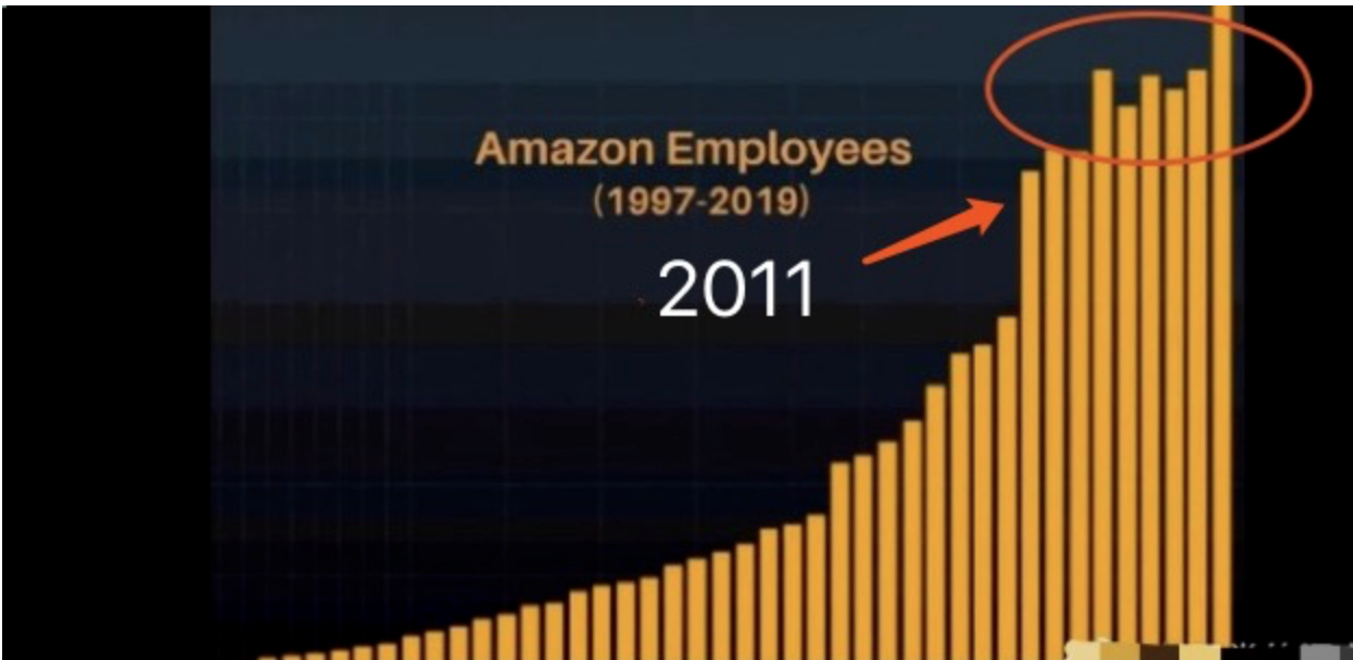 但这种增长并不是通过大肆增加员工完成的。上图是亚马逊的员工数量图,从2011年开始并没有大规模增加,甚至其中有5年几乎是不变的。可以简单理解为增长是依靠技术进步完成的,如更好的云平台、更好的平台技术、更好的物流技术等。