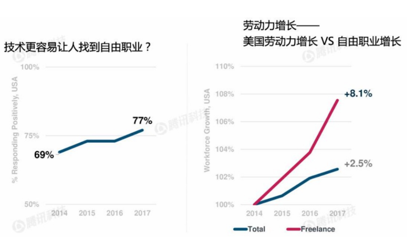 如图3,技术的进步使得越来越多的人成为自由职业者。从美国来看,从2014年整体劳动力增长了2.5%,而自由职业者增长了8.1%;相信技术进步容易让人找到自由职业观点的也从69%上升到77%。按照这个增长比例,未来可能有一般人成为自由职业者。