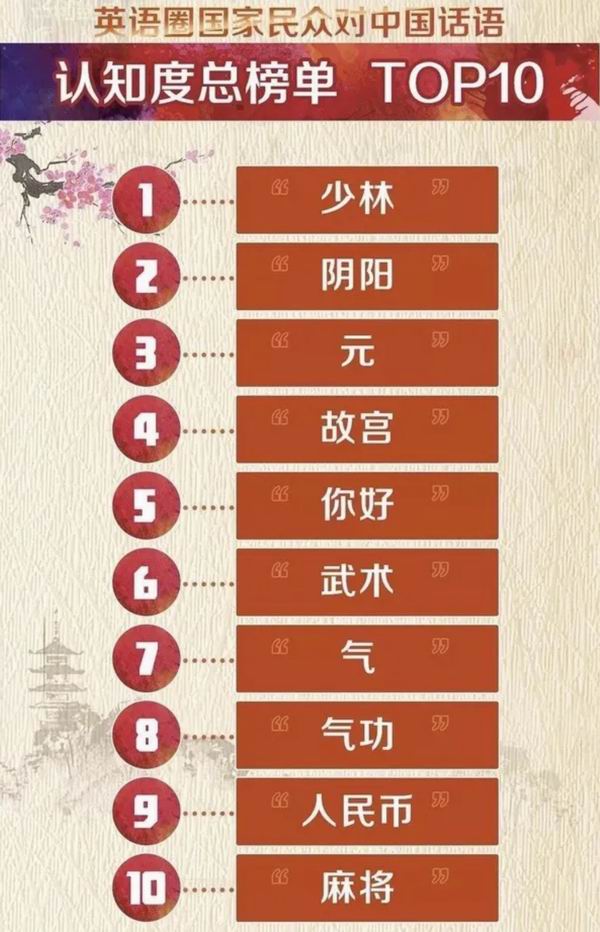 中国外文局曾在美英澳等8个英语圈国家的民众中做调查,并发布《中国话语海外认知度调研报告》,在这份报告中"少林"、"阴阳"、"气"、"气功"等词语挤进top10。