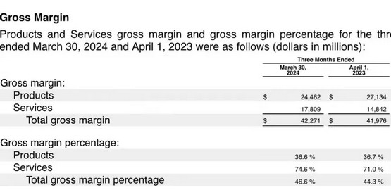 苹果公司 2023 年财报显示,苹果 2023 财年总营收 3833 亿美元。营收贡献第一位是 iphone 业务,营收贡献第二位就是包括苹果商店在内的服务收入,占比达 22%。而在今年第一季度财报里能看到,截止 2024 年 3 月 30 日,苹果服务收入的毛利率百分比达到 74.6%,其中就包含了高额的苹果税。