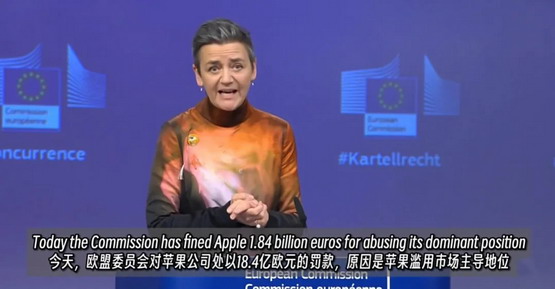 在这之前,欧盟曾以反垄断为由向苹果开出过一张 18.4 亿欧元的罚单,欧盟委员会负责竞争政策的执行副主席表示,苹果滥用市场主导地位,限制开发者向消费者介绍苹果生态系统之外更便宜的流媒体音乐服务,这是非法的。