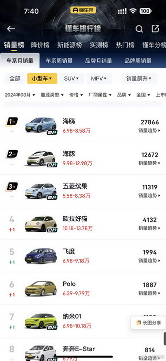 今天,飞度在小型车销量排行榜第 5,好像也还行。睁大眼睛一看,销量 1994 台。