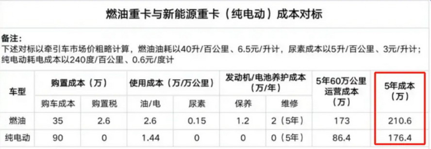 《中国新能源重卡概况和未来发展趋势》里有个数据,从 TCO 的角度看,同样规格的车子跑 60 万公里,油车的使用成本要 211 万,而纯电重卡只要 177 万元,能省下来将近?34 万块。