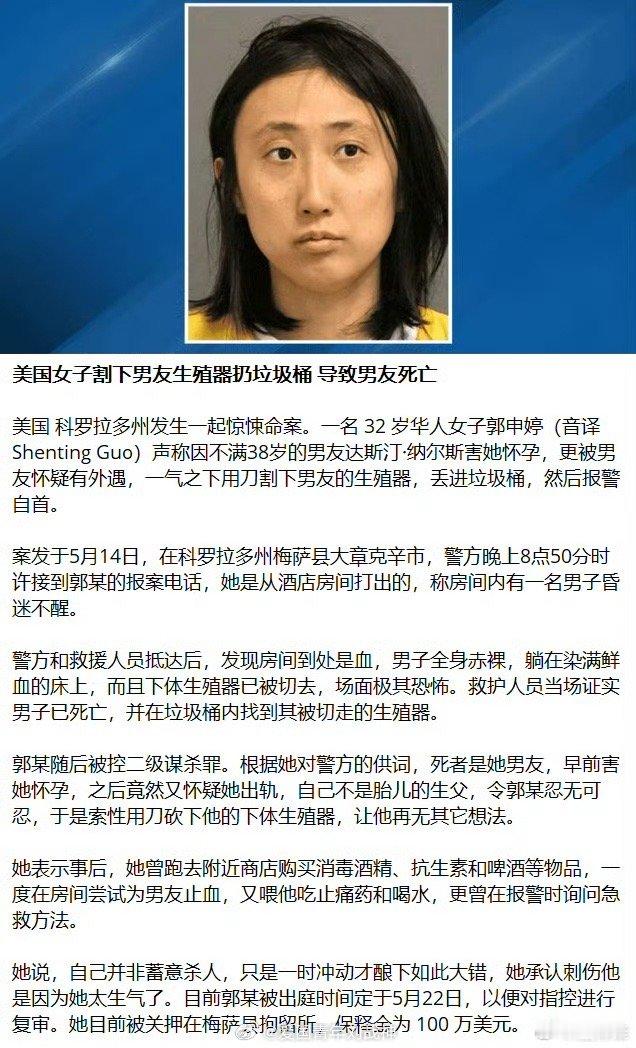 美国女子割下男友生殖器导致其死亡