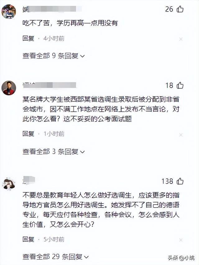 明面儿上肯定不会明文规定,但将来在选调生的选拔上,多多少少会偏向男生,因为有了她这么个女生不能吃苦、随时会跑路的先例,用人单位为了省事儿,大概率会选随时跑路风险更低的人,哪怕只是低 1%。