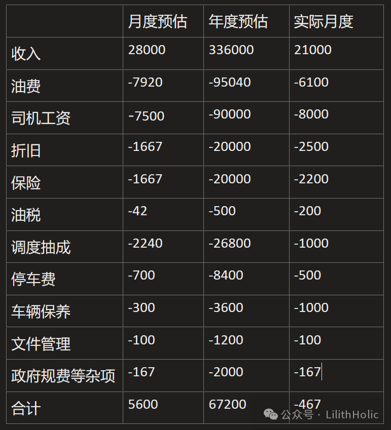 上图实际月度是我根据后来实际成本做调整后的收入大概的表,跟真实的情况比,还缺少了车厢的折旧费用。