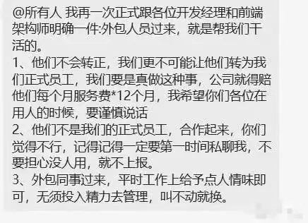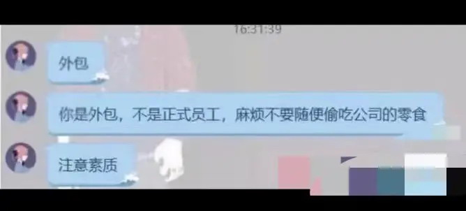 外包员工的不易,已经是一个老生常谈的问题。不同颜色的工牌几乎是标配,几乎所有的正编员工都是自己的 “领导”,如果运气不好还会遇到不加掩饰的歧视。比如一个广为流传的截图中,正编员工怒斥外包 “不要随便偷吃公司的零食”,或是嘱咐其他正编同事 “给予(外包)点人情味就行”。