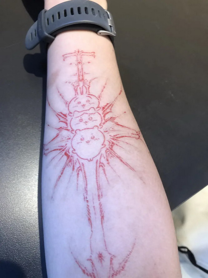 看到纸条的内容我愣住了,虽然我手臂上确实有一点之前的痕迹,但是已经比较淡了,所以我非常确定她们看到的是我昨天刚贴在手腕上的 chiikawa 红色纹身,可能是坐的有点距离,所以看错了以为是红色的割痕😭