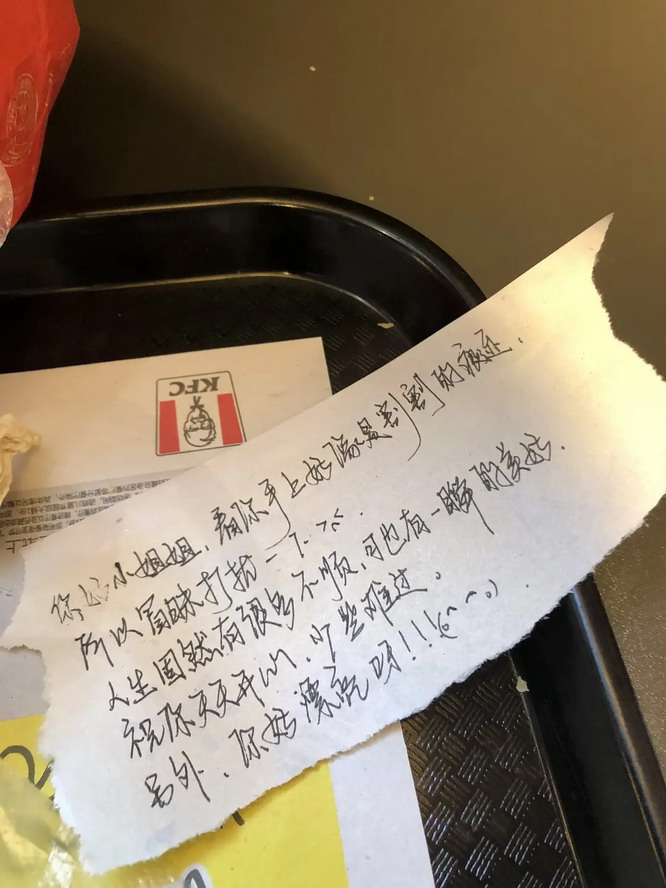 @Nlvsu: 今天去 kfc 吃东西,隔壁坐了两个妹妹,应该是初高中的年纪,刚坐下没多久就发现她们总是时不时瞅我,我一开始还有点不自在,在心里默默嘟囔了一下,结果在她们吃完走的时候其中一个妹妹突然冲过来放了一个纸条然后又开始跑开了。