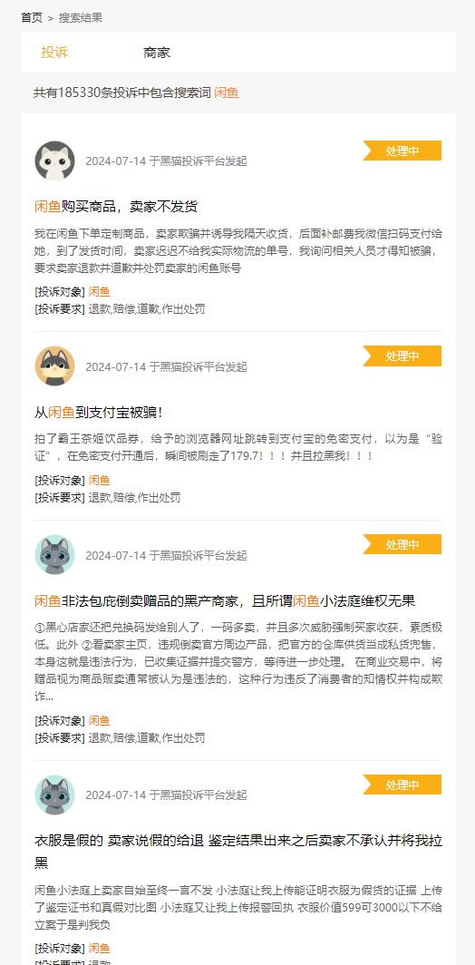在黑猫投诉上搜索.“闲鱼”.关键字,相关投诉高达.185330.次。