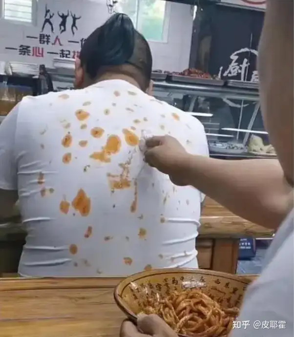 这种混杂着热油和辣椒的调料,只要溅到衣服上,就是当仁不让的一个鲜红鲜红的油点子,属于不赶紧回家,脱下来上点科技与狠活,根本洗不干净的存在。
