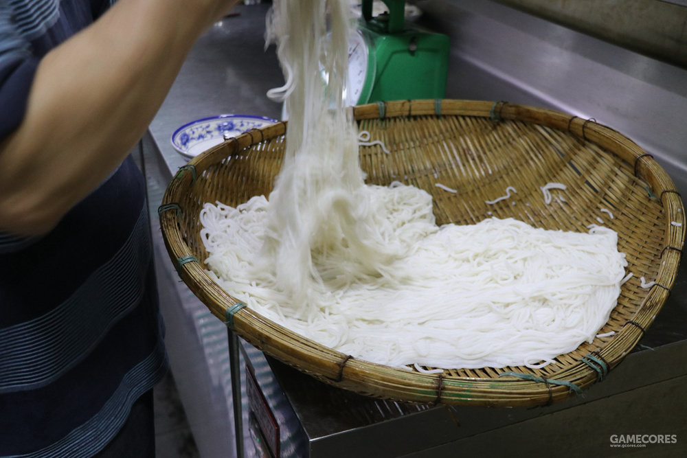 在东莞厚街,几乎所有烧鹅店的手工濑粉都曾出自球叔之手。而球叔制粉的独特之处,在于一锅熟米打成的米浆。将洗净的米放入水中浸泡一段时间后,用竹篮过水,再把生米与米浆一同放入米舂中打成粉桨,放干后做成米糊塞进布袋,将挤压布袋产出的长粉条直接下入锅中煮熟,捞出后放入冷水浸泡,最后置入大缸阴干。等濑粉阴干后,会送往厚街的各家烧鹅店。