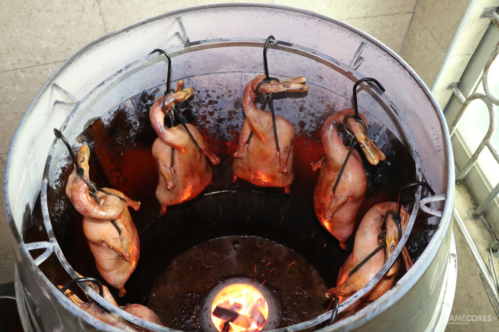 据阿强介绍,东莞各家店的烧鹅,在工序上并无太大差异,但在用料与细节上会有些不同。他们的做法是先将酱料塞入鹅腹并缝住,用机械气泵为鹅体内注入气体(为的是将皮与肉分开),将整只鹅放入滚烫的糖水中过水,融堵住鹅表皮的裂缝使其密不通风,等确认鹅体内充满并且不会跑气后,取出晾干(表皮湿润的鹅烤出来的色泽不亮)。做好以上的准备工作后,将鹅放入竹炭烤炉40至50分钟后便可取出享用。