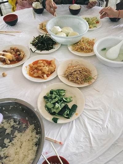 马尾女孩也径直跳过了购物环节,我们在餐厅相遇,与陌生人拼足一桌。上菜了,海带丝、萝卜块、拍黄瓜、豆腐丝、土豆丝、豆芽菜、圆白菜,和几乎全是面粉的丸子,汤格外清透,几丝蛋花悬浮其中。原来八菜一汤是八凉菜一汤。