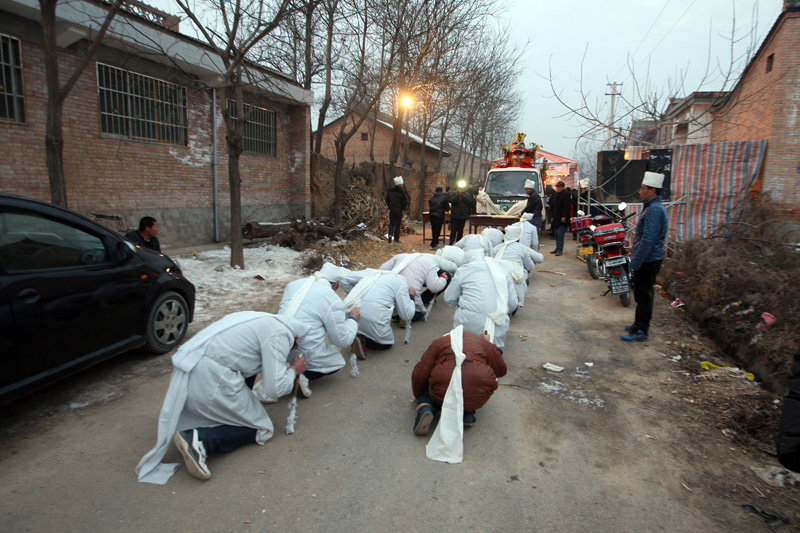 于是,孝子们就一路跟随,拿着哭丧棒,沿街走向设下大宾席的小院。两旁看热闹的老幼,都靠在墙根屋角,注视着这一队白衣长龙,叽叽喳喳地指点。我木然地跟着人群,随着他们跪倒、磕头,在白帽子的指挥下,我们又站起来继续走。那天总共有六位大宾,我们就这样跪跪起起,走了六趟。
