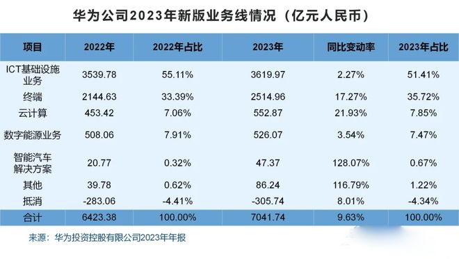 2023.年华为.ICT.基础设施业务实现销售收入.3,620.亿元人民币,同比增长.2.3%;终端业务实现销售收入.2,515.亿元人民币,同比增长.17.3%;云计算业务实现销售收入.553.亿元人民币,同比增长.21.9%;数字能源业务实现销售收入.526.亿元人民币,同比增长.3.5%;智能汽车解决方案业务实现销售收入.47.亿元人民币,同比增长.128.1%。