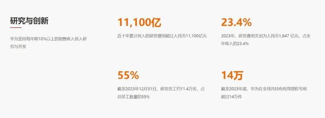 最让局长震撼的还是华为惊人的研发投入数额,报告显示,2023.年华为研发投入达到.1647.亿元人民币,占全年收入的.23.4%,十年累计投入的研发费用超过.11100.亿元人民币。