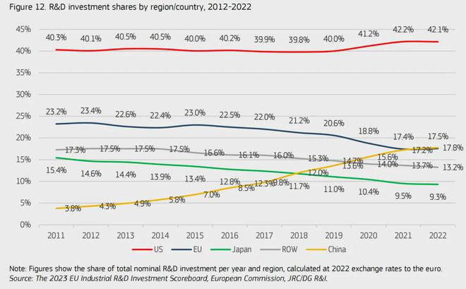 中国现在人均研发费用和欧洲、日本一个水准,同时还拥有远超欧洲日本的年增幅,而且从.2012.到.2022.连续.10.年都是如此。