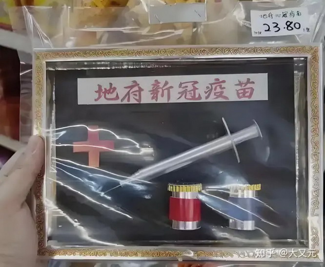 就拿前两年疫情来说,人家也没闲着,顺应时代开发出了新品:地府新冠疫苗、口罩、消毒液、红外体温枪。