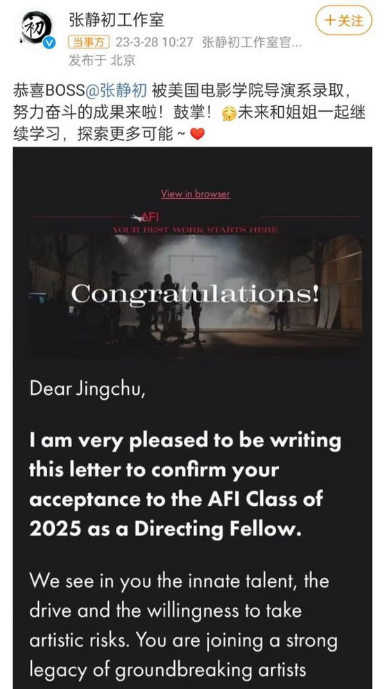 去年.3.月,张静初被美国电影学院导演系(简称.AFI)录取,正式成为一枚美国电影留子。