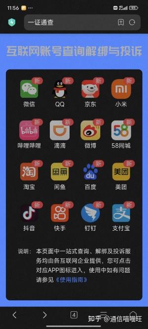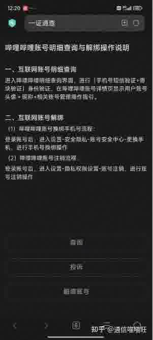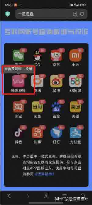 8、对照第四步中短信通知消息,点击要解绑的 APP。比如我的手机卡注册了一个哔哩哔哩账号,点击哔哩哔哩 APP 就会显示 “查询及解绑 投诉”–> 点击查询及解绑 –> 新窗口点击 “解绑账号”,然后按要求下一步下一步即可。