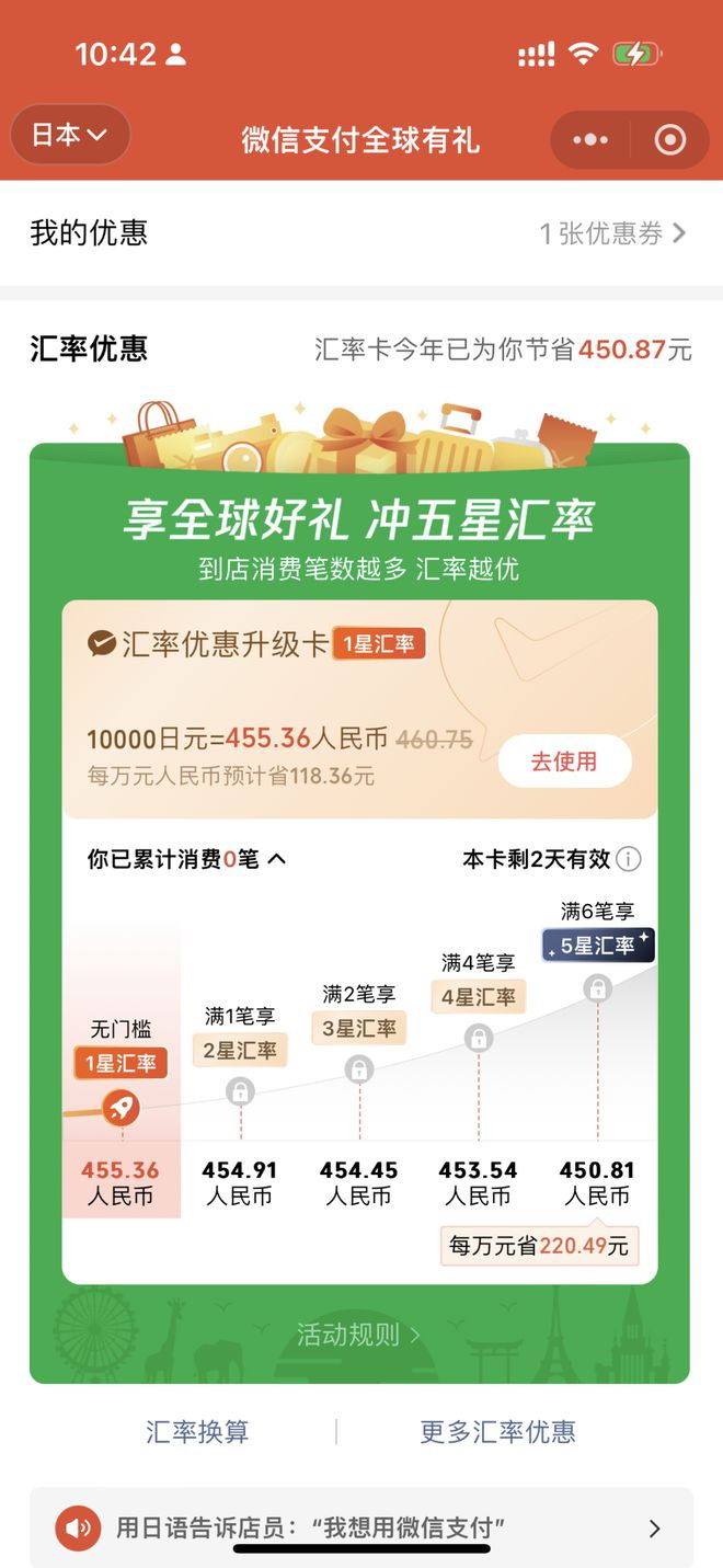 3,在日本,汇率最好的是微信支付。你只要随便找个便利店,先买.6.瓶水,升级到五星汇率,然后就能以非常低的汇率买东西。
