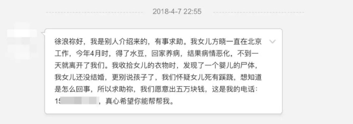 方晓她妈找到我,就是想知道发生了什么,这个死婴是怎么来的怎么没的,问我能不能帮帮忙,给分析分析、调查调查。