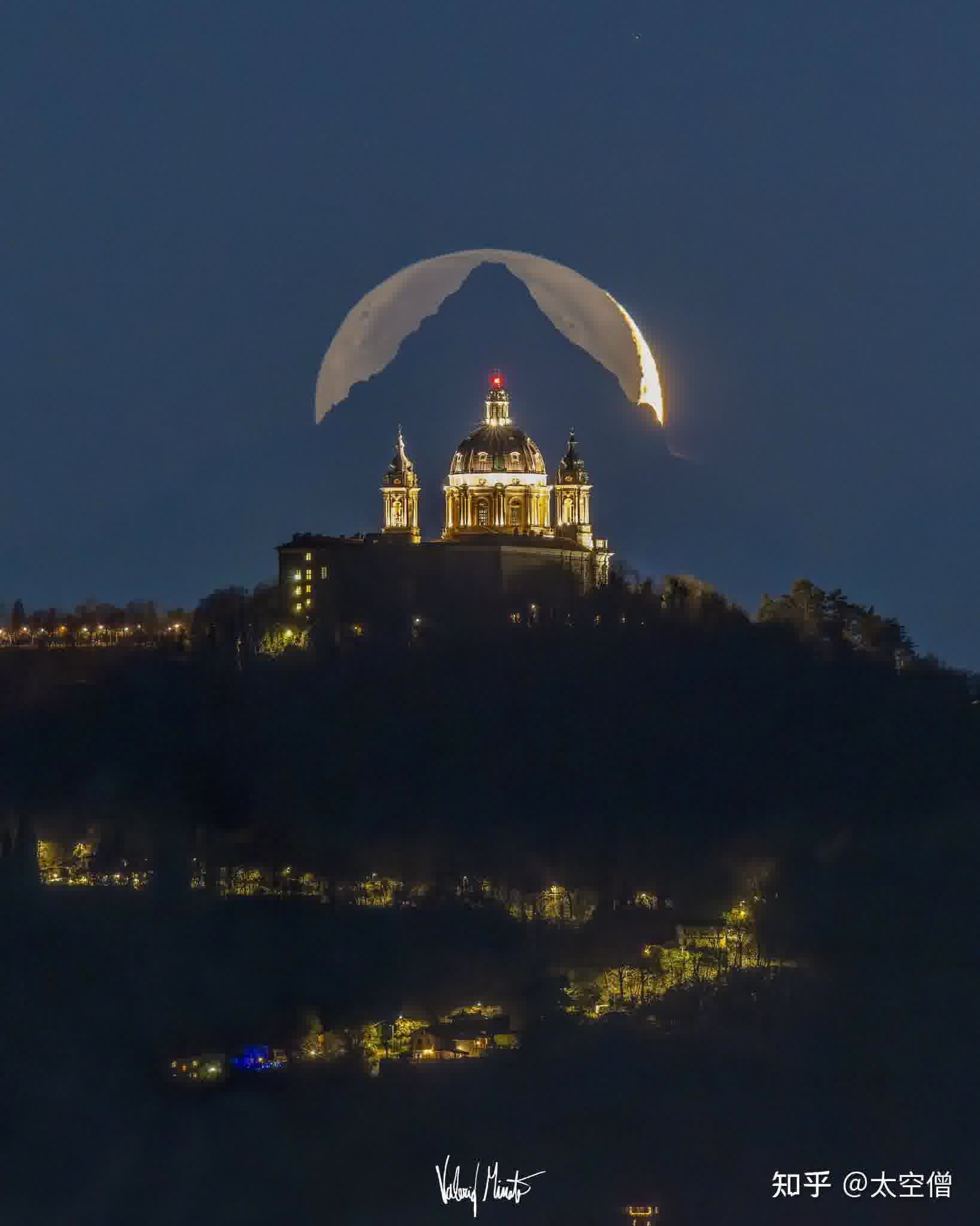 照片拍摄于意大利皮埃蒙特,前景中的大教堂是苏佩尔加大教堂,中间的山是蒙维索山,背景是月亮。