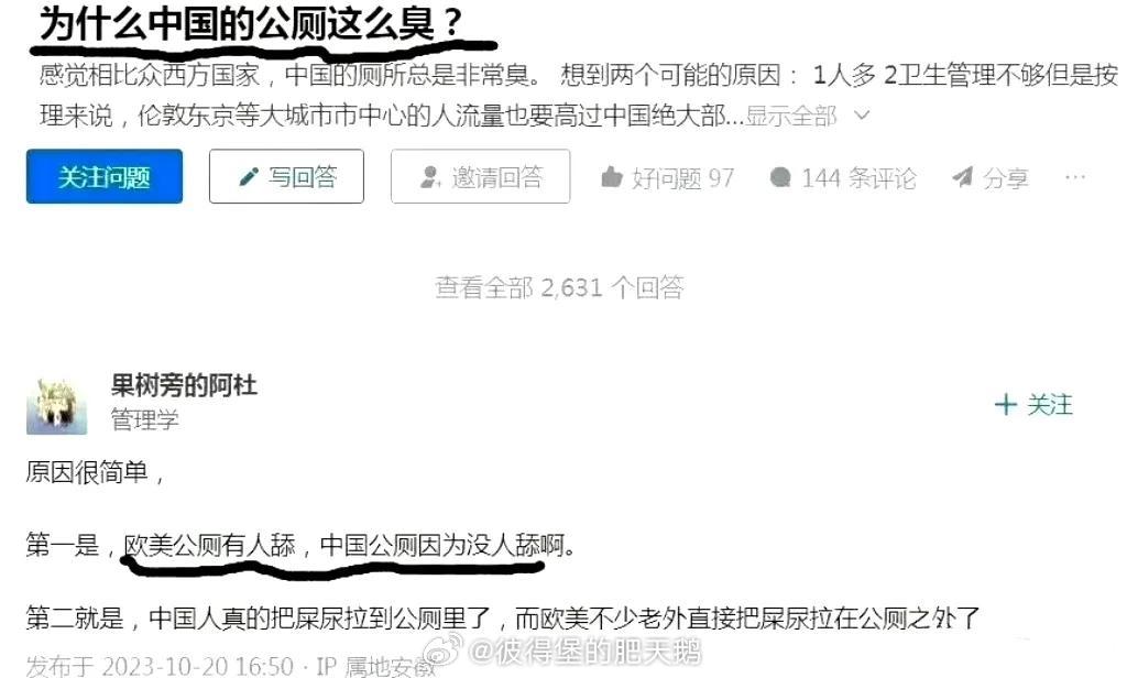 它问:为什么中国的公厕那么臭。还挑衅地注释道:“感觉相比众西方国家,中国的厕所总是非常臭,想到两个可能的原因:1是人多,2是卫生管理不到位。