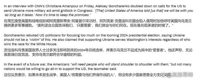这大概是我近期看到的最令人迷惑的一条国际新闻了。当地时间2月23日,乌克兰议员阿列克谢·贡恰连科(Aleksey Goncharenko)在接受CNN采访时表示:“身为自由世界的第二强军,乌克兰已经做好了随时与美军并肩作战的准备。美国曾经和我们说过:只要乌克兰需要,美国就会与乌克兰同在。现在,我想美国是时候该兑现当初的承诺了。美国政界把太多注意力放在了即将到来的2024年总统大选上,这不好。乌克兰不应成为美国大选的受害者。无论谁在选战中笑到最后,入主白宫,支持乌克兰都符合华盛顿的利益。”