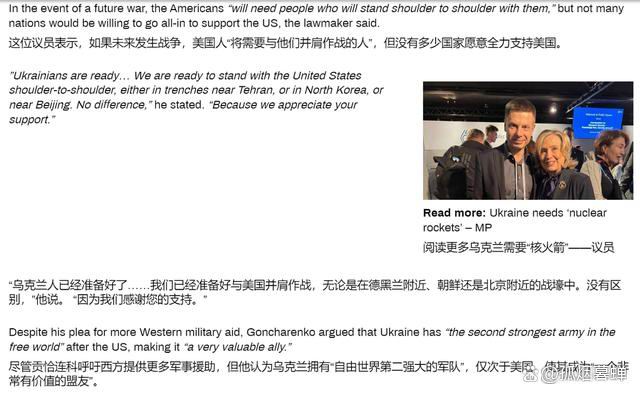 不仅如此,贡恰连科还说:“如果将来发生战争了,美国需要盟友与之并肩作战。而实际情况是,并没有多少国家愿意全力以赴支持美国。可我们不同,乌克兰人已经准备好了,准备好与美国共赴沙场了。无论是要去德黑兰,还是要去朝鲜半岛,抑或是要去北京。不管是哪里的战壕,对我们而言都没有区别。这一切只因我们对美国心怀谢意。”