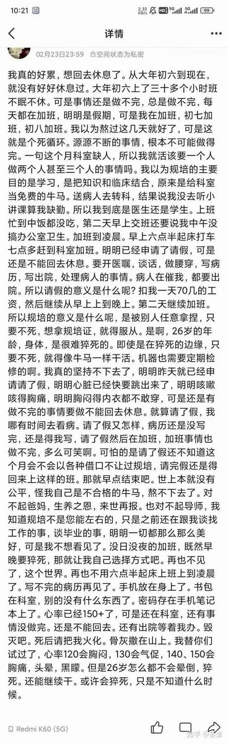 通过死者的遗书不难发现,除了工作强度大之外,“假期加班”、“带病上班不准假”、“帮病人转科被算缺勤小课”、“工作忙的饭都吃不上却被埋怨不搞卫生”等成了压死骆驼的最后一根稻草。“自己是不合格的牛马”成了死者对自己最无奈的评价。