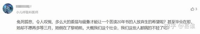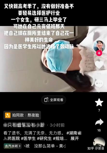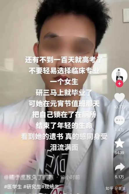 该事件在各类网络社交平台发酵,众多医学生、规培生、医护们都在为其惋惜悲痛、感同身受。据了解死者死后经法医鉴定其身体左颈部有切口,而且身旁有手术刀,对此有网友表示“这得是何等的绝望才有勇气自刎而死”。