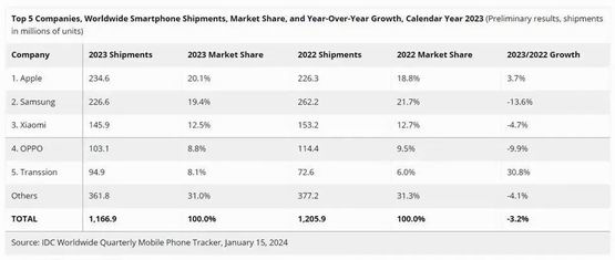 一家名不见经传的手机厂商,2023 年居然卖出了超过 9400 万台智能手机,获得了超过 600 亿元的收入,一举成为全球第五大手机厂商。