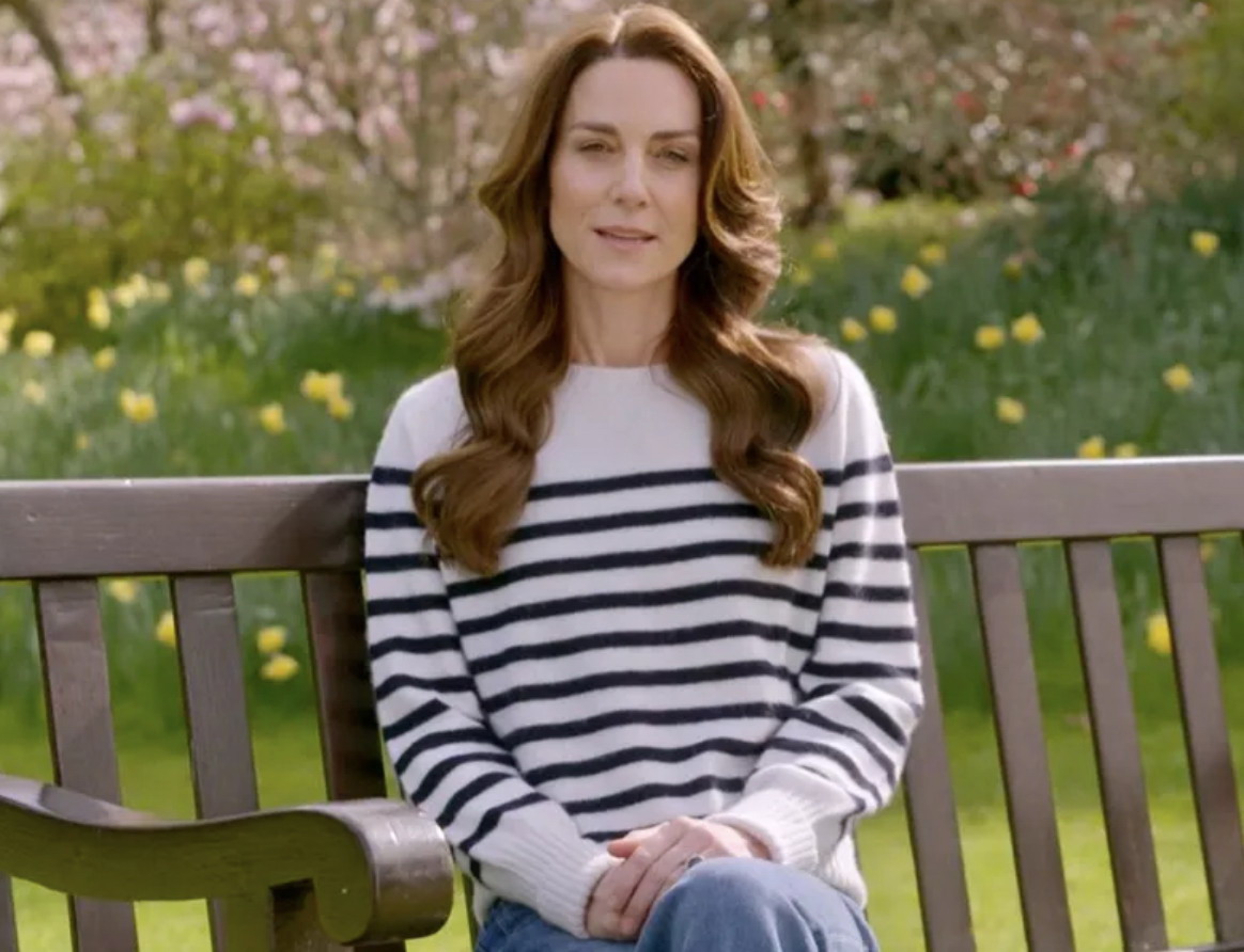 视频中的她坐在长椅上,背景春暖花开,凯特面容消瘦,非常憔悴,脸上挂着熟悉的微笑。