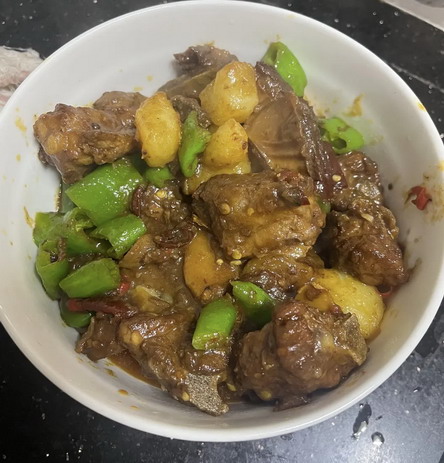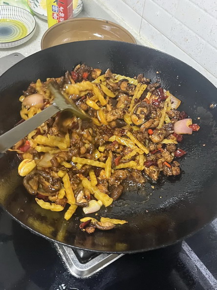 但这个火候怎么拿捏,什么叫炒干水分我真的不太懂,感觉好像炒变色了,那应该就差不多了。但是炒出来的排骨,就是有??的味道,调料跟配菜的味道是分开各是各的味儿…… 炒的鸡,鸡毛味,炒的鸭,那不用说了,感觉是鸭屎味臭哄哄的……