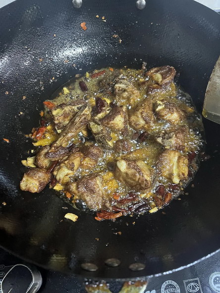 热锅或者冷锅都无所谓,油热了就可以了,油可以稍微倒多一点。刚开始炒的时候,食材进去后油是浑浊的,感觉油里有水汽,虽然肉变色了,但是锅铲铲着很轻松,没有粘锅的触感,这个时候可以丢几颗花椒进去,然后炒着炒着,油变清亮了,没有那么多大泡泡了,排骨上的肉边缘的颜色变得有点焦褐色,而且锅铲铲的时候觉得锅底有一点粘,那么这个时候就可以倒料酒了。
