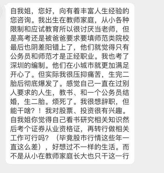 @自我的 SZ:这是昨天深圳有个网友,她家是双体制内想出去折腾做股票投资的投稿,网友们纷纷给出了几百条意见。昨晚后续投稿网友看到后,还是想换个职业折腾一下自己。