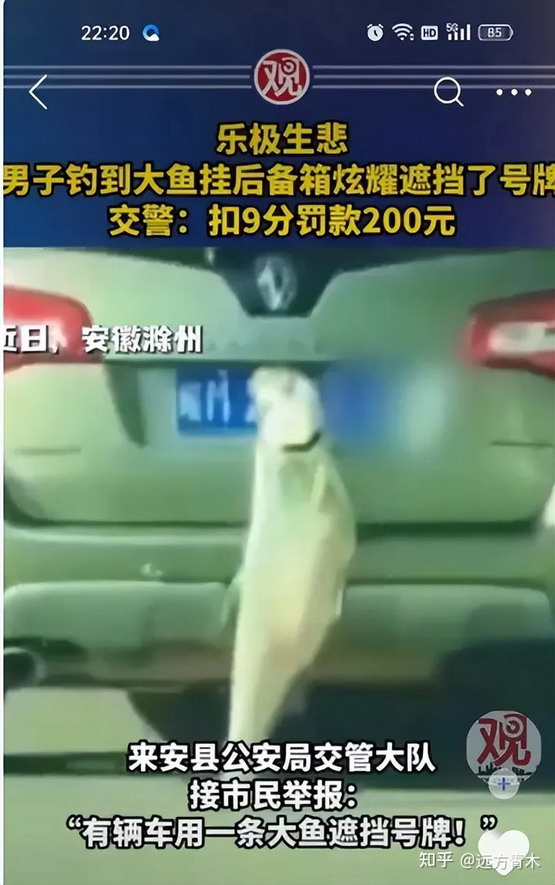 前些天安徽滁州有个钓鱼佬钓上一条大鱼后兴奋的挂在车后备箱上游城示众,被人举报遮挡号牌后被扣9分罚款200元外加上新闻。